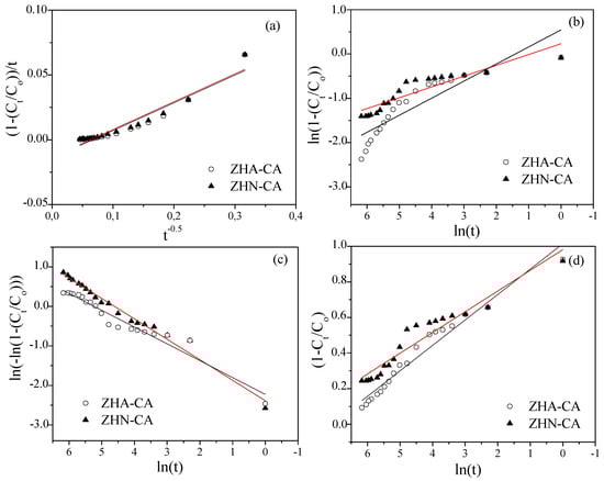 Plots of kinetic models to the experimental release of CA anions from ZHN–CA and ZHA–CA hybrid materials: (a) parabolic, (b) Freundlich, (c) Avrami-Erofe’ev, and (d) Elovich models.