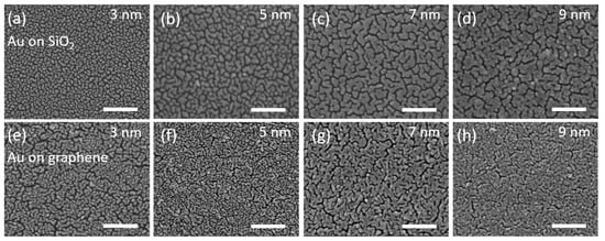 The ratio of G and 2D bands (~0.6) indicates the single layer of graphene [,], and the ratio of the D and G bands (~0.09) indicates a low concentration of defects [,]. Additionally, the 2D band exhibits a single Lorentzian peak, while in the case two or more layers, it has broadband, which can be fitted by several Lorentzian peaks. Therefore, the profile of the 2D band is also used to identify monolayers []. All thicknesses of the deposited gold films were monitored both by a quartz sensor in the deposition installation and by independent measurements of the thickness by AFM at the border with a scratch (Figure 1a,b). SEM images of gold films with thicknesses of 3, 5, 7 and 9 nm (Figure 2) deposited on graphene/ SiO2/Si and SiO2/Si substrates show thin-film growing dynamics. The gold clusters grow faster along the substrate plane than in height. So, the individual clusters gradually begin to form a labyrinthine structure with increasing thickness and finally constitute an almost continuous film on both substrates. This can be seen in more detail in Figure S2, where SEM images for the films with thicknesses from 3 to 10 nm and a step of 1 nm are presented. Metal–graphene contact has been studied in some detail [], and therefore it is known that the growth of metals on the surface of graphene differs markedly from the growth of metals on SiO2/Si substrates. Figure 2 and Figure S2 reflect this difference in film formation. Gold films with the same thickness deposited on graphene, consist of clusters with smaller sizes compared to gold films deposited on pure SiO2/Si substrates (Figure 2a–d). The distances between these clusters are also less than for clusters formed on substrates without graphene. Thus, a gold film on graphene covers a larger area of the substrate compared to a film on a SiO2/Si substrate of the same thickness. This could be due to the greater adhesion of gold and SiO2 in comparison to the adhesion between gold and graphene [].