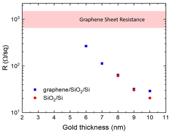 Although we have shown the difference in thicknesses between those measured by AFM and by the quartz sensor, in the further representation of the experimental data we used the thicknesses given by the quartz sensor. Before the Raman measurements, we found a percolation threshold for deposited films by electrical and optical methods. The percolation threshold for films on the SiO2/Si substrate can be determined by sheet resistance measurements [,]. The experimental setup can be seen in the Supplementary Materials (Figure S3). The average sheet resistance for each of the thicknesses of the gold films is shown in Figure 3. The gold films deposited on a SiO2/Si substrate begin to conduct at thicknesses of 8 nm. Therefore, we can assume that the percolation threshold for such films is between 7 and 8 nm. Because graphene has very high electrical conductivity, the definition of the percolation threshold for the graphene/SiO2/Si substrate is more complicated than for previous samples, since this type of sample has conductivity at all thicknesses due to graphene. The sheet resistance of graphene was measured and the value ranged from 700 to 1600 Ω/sq. For films on graphene/SiO2/Si substrate, conductivity is observed over the entire range, but films can be considered percolated when their sheet resistance is much lower than the sheet resistance of graphene. According to this criterion, we can estimate that the percolation threshold is between 5 and 6 nm. Mostly, electrical measurements are enough to uniquely determine the film thickness at which there is a percolation threshold.