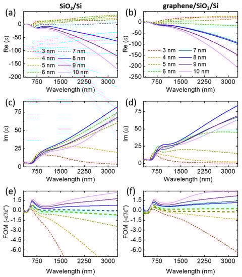 In order to compare the metallic optical properties of films on two substrates, we calculated the plasmonic figure of merit (FOM), which is equal to −ε’/ε” and is presented in Figure 4e,f. FOM curves on the graph become higher as the film thicknesses increase and their specific behavior clearly demonstrates a difference in the quality [] of the films on SiO2/Si (Figure 4e) and graphene/SiO2/Si (Figure 4f) in the infrared range for thicknesses from 3 to 7 nm. Starting from 8 nm for SiO2/Si and from 7 nm for graphene/SiO2/Si, the slope of curves in the infrared region changes sign from negative to positive. From this, we concluded that the percolation threshold for films on the SiO2/Si substrate is between 7 and 8 nm, which correlates well with the electrical measurements.