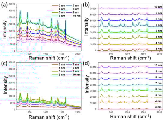 Since the data obtained by ellipsometry have a good agreement with the electrical measurements for the films on the SiO2/Si, we can apply similar reasoning to estimate the percolation threshold for the films on the graphene/SiO2/Si substrate. The estimation exhibits the value between 6 and 7 nm, which is close to the region estimated by the electrical measurements. Thus, based on the measurements mentioned above, we can conclude that the percolation threshold for our gold films on the SiO2/Si substrate is between 7 and 8 nm and for the gold films on the graphene/SiO2/Si substrate is between 6 and 7 nm. In order to compare the hybrid graphene/gold substrates and substrates without graphene and estimate the enhancement factor of fabricated films, we used Raman microscopy. After the abovementioned measurements, all of the samples were covered by Raman dye CV (see Section 2). This Raman-active dye is chosen for its well-known and well-characterized properties. CV is a resonant dye for our excitation wavelength and can be a good marker to estimate the luminescence quenching. The dependence intensity of the SERS spectra on the gold film thickness is seen in Figure 5. The intensity gradually increases with increasing gold thickness from 3 nm to 7 nm in the case of films on the SiO2/Si (Figure 5a,b) and from 3 to 6 nm for the films on the graphene/SiO2/Si substrates (Figure 5c,d), respectively. The increased intensity of the SERS spectra for these films corresponds to increased FE, due to a decreased gap between the clusters. The maximum SERS signal was obtained for the gold films with thicknesses of 7 nm on the SiO2/Si and of 6 nm on the graphene/SiO2/Si substrates. This corresponds to the thicknesses defined as the percolation threshold by electrical and optical measurements. This is the case when the interparticle spaces lead to the formation of “hot spots” in the nano-gaps between clusters and as a result, to maximizing the intensity of the SERS spectra. Then, the intensity of the signal begins to decrease with increasing film thickness and reaches the minimum at a thickness of 10 nm for both types of substrate.