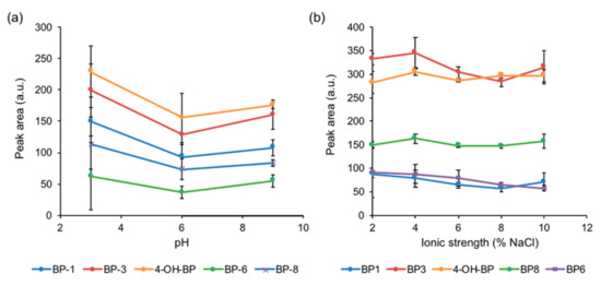 Effect of (a) pH and (b) ionic strength, expressed as % of NaCl, on the peak area of the analytes calculated from the chromatograms obtained after DμSPE with the developed method at the different conditions and determination via LC-UV.