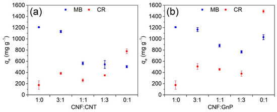 The effect of initial dye concentration on the adsorption capacity was investigated in the 10–1000 mg L−1 and 10–2000 mg L−1 ranges for MB and CR, respectively. The systems were mixed at 25 °C and 120 rpm for 16 h and equilibrium was declared when there was no appreciable change in solution concentration with additional contact time. Concerning all adsorbents, at low dye concentration, adsorption increased dramatically with increasing concentration (Figure 6). The adsorption of MB reached a plateau when residual MB concentration was above 200 mg L−1 in all cases. The final MB adsorption at equilibrium for CNF–GnP was 1207.5 mg g−1 at the initial MB concentration of 1000 mg L−1. The adsorption of CR increased relatively slowly when the residual CR concentration was above 400 mg L−1 in all cases. The final CR adsorption at equilibrium of CNF–GnP was 507.1 mg g−1 at the initial CR concentration of 2000 mg L−1.