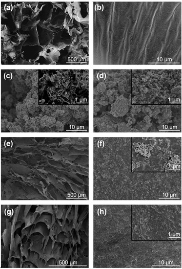 FE–SEM images of CNF aerogel (a,b), CNT (c), GnP (d), CNF–CNT aerogel (e,f) and CNF–GnP aerogel (g,h). The insets in (c,d,f,h) are FE–SEM images of CNT, GnP, CNF–CNT and CNF–GnP at a high magnification, respectively.
