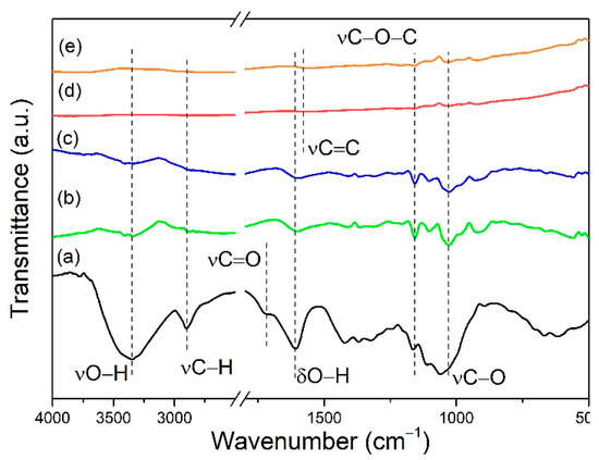 FTIR spectra of CNF (a), CNF–CNT (b), CNF–GnP (c), CNT (d) and GnP (e). To optimize the representation, the region of 2500–1800 cm−1 is omitted.