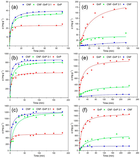 Effects of contact time on the dye removal efficiencies of MB and CR using CNF, CNF–GnP and GnP. Initial MB dye concentration: 10 mg L−1 (a), 250 mg L−1 (b), 500 mg L−1 (c). Initial CR concentration: 100 mg L−1 (d), 600 mg L−1 (e), 2000 mg L−1 (f). Pseudo-second-order adsorption kinetics was applied for all conditions in (a–f).
