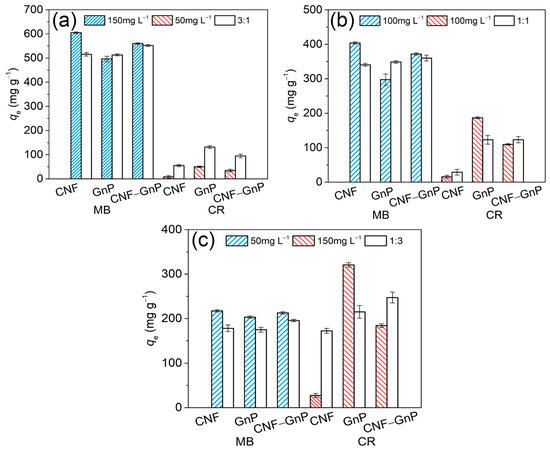 Regarding industrial wastewater, different types of dyes could be found and they compete for the adsorption sites on the surface of the adsorbent. To investigate the adsorption capacity of CNF–GnP in a more practical setting, an MB and CR binary system was prepared and investigated. The mass ratio of MB to CR in the solution was designed to be 3:1, 1:1 and 1:3. The total initial dye concentration was set to be 200 mg L−1. The adsorption of dye in single and binary systems was compared (Figure 7). Shown in Figure 7a, when the mass ratio of MB to CR was 3:1 (i.e., MB = 150 mg L−1, CR = 50 mg L−1), the adsorption of MB onto pure CNF in the binary system was lower than that in the single system, indicating MB and CR competed for adsorption sites on the CNF surface. However, the adsorption of MB onto pure GnP and CNF–GnP was similar in both the single and binary systems. The adsorption of CR onto all adsorbents increased in the binary system compared to that in the single system. This may be attributed to the Coulombic attraction between cationic MB adsorbed on the material surface and anionic CR in solution. Similarly, when the mass ratio of MB to CR was 1:1 (Figure 7b), the adsorption of MB was lower and the CR uptake for pure CNF and CNF–GnP was higher in the binary system than in the single system. However, the adsorption of CR onto pure GnP was strongly affected by the presence of MB when the CR concentration increased. Moreover, when CR became the dominant molecule in the binary system (i.e., MB to CR ratio was 1:3, Figure 7c), the CNF–GnP hybrid was able to adsorb even more CR than pure GnP. Regarding all binary systems, the adsorption capacity of CNF–GnP was the best among the different nano adsorbents, and the presence of one dye had no negative impact on the adsorption of the other dye. The hybrid CNF–GnP adsorbed the highest amount of MB and CR combined per unit mass of adsorbent. Perhaps the cationic MB and anionic CR adsorbed onto different types of adsorption sites on the CNF–GnP surface. The cationic MB mainly adsorbed onto the negatively charged CNF portion, while most of the CR adsorbed onto the GnP portion. MB adsorbed on the material surface also may attract anionic CR in solution via Coulombic attraction.