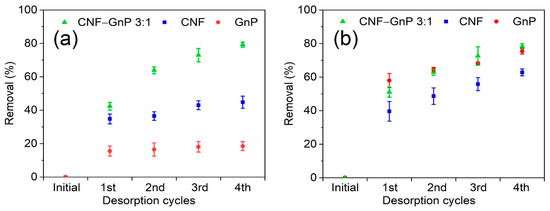 Desorption of MB and CR from CNF, GnP and CNF–GnP 3:1 was performed in ethanol, acetonitrile, acetone or 400 mM NaCl at 25 °C. First, the adsorbents were added into 20 mL of 100 mg L−1 dye solutions for adsorption at 120 rpm and then taken out from the dye solutions after 16 h. These adsorbents were transferred to 20 mL of desorption agents. After 1h, the adsorbents were removed and the dye concentration in the solution was measured. The adsorbents might again have been transferred to a fresh desorption agent and the desorption step was repeated for several cycles. Dye percentage removal (%) was calculated by Equation (5):