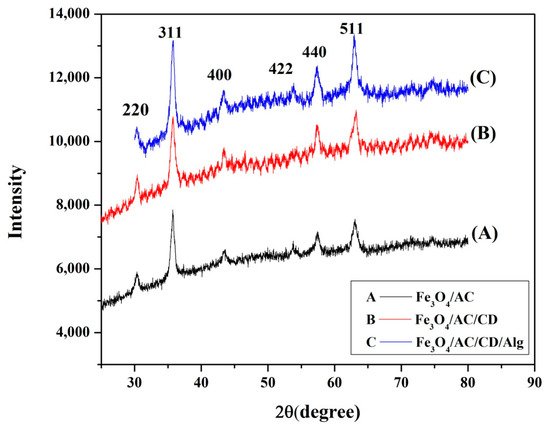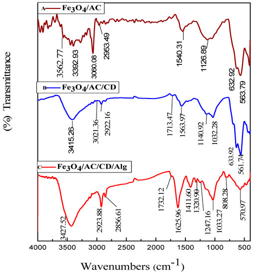 2.4. Preparation of Fe3O4/AC/CD/Alg Polymer Composite Gel Beads