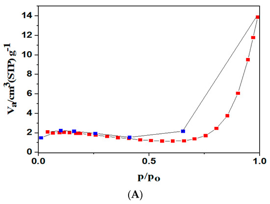 Figure 6A showed the N2 adsorption and desorption isotherms for Fe3O4/AC/CD/Alg at −196 °C. The Brunauer–Emmett–Teller (BET) analysis was utilized for determining the surface area of the material. The BET specific surface area of was 8 m2 g−1, and Figure 6B showed the total pore volume was 0.02 cm3 g−1 with a mean pore diameter of 1.47 nm. This shows that the surface area of the material is larger than of other adsorbents [51]. The textural properties of the Fe3O4/AC/CD/Alg nanocomposite are shown in Table 2.