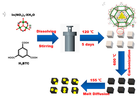 In this work, we choose a typical In-based MOF (CPM-5) as an initial precursor [21]. CPM-5 has a unique and attractive three-dimensional structure, which makes it have high carbon dioxide (CO2) adsorption capacity, thermal and water stability. This is because there are two valence states in its structure, namely, one in the form of a trinuclear cluster with a positive charge, the other in the form of a single metal with a negative charge. The combination of them turns CPM-5 into a special cage structure. Therefore, the In-MOF (CPM-5) is carbonized directly in the furnace at 600 °C under N2 gas protection, resulting in a large specific surface area and micro-mesoporous structure. The indium oxide particles formed in the carbonization process are combined with CPM-5 to form a core-shell structure. The existence of this structure will reduce the loss of active substances and improve the conversion efficiency of materials. When used as a positive electrode for Li-S batteries, they have high reversible capacity, high coulombic efficiency, and excellent rate performance [22,23].
