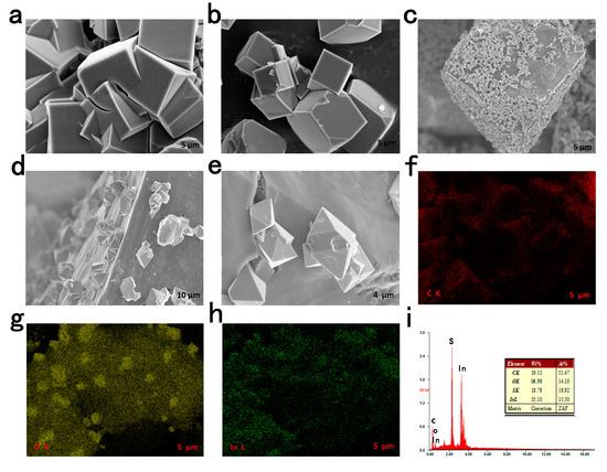 SEM images of: (a,b) CPM-5 and (c–e) CPM-5-C-600. (f–h) The elemental mapping of Indium oxide particles of CPM-5-C-600. (i) The corresponding EDX of CPM-5-C-600@S.