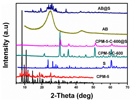 Powder X-ray diffraction patterns of the CPM-5, CPM-5-C-600, CPM-5-C-600@S, AB, and AB@S are shown in Figure 3. By comparing with the standard card, a large quantity of pure CPM-5 (gram-scale) can be readily prepared. The characteristic peak of CPM-5 can be seen between 5° and 10° obviously, which shows its good crystallinity. There is no impurity peak that indicates its good purity [21]. For AB, sharp diffraction peaks appearing near 26° and 44° are the characteristics of the carbon materials [26]. The peaks corresponding to the sulfur were observed from AB@S composite, indicating that the sulfur particles are distributed to the materials uniformly [27]. On the contrary, there were no obvious peaks appearing in the XRD profile of CPM-5-C-600, suggesting comparatively low graphite degree of the porous carbon derived from CPM-5 because of a low carbonization temperature [27,28]. Besides, the peaks at 31°, 36° and 52° have very strong diffraction intensity, which are the feature peaks of indium oxide [29]. This also verified our conjecture about indium oxide in SEM analysis. This indicates that central indium exists in MOF in the form of metal oxides after carbonization. The peaks of sulfur were not found in CPM-5-C@S, implying that the confining of sulfur within the CPM-5-C-600 pores is due to a relatively large pore volume and specific area.