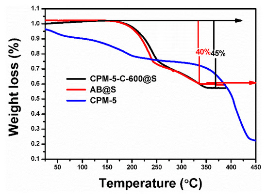 The thermogravimetric test of CPM-5, CPM-5-C-600@S and AB@S materials were shown in the Figure 5 below. The curves of CPM-5 shows that the removal of solvent molecules occured in the temperature range of 40–230 °C and there was no further weight loss up to 300 °C. This exhibited that the CPM-5 structure had good thermal stability [21]. The carbonized CPM-5 tended to be stable above 350 °C, which also reflected its structural and thermal stability. It can be seen from the figure that the sulfur content of the two samples was 40% and 45% respectively. Both samples lost weight between 150 and 350 °C. However, by comparing the heat loss rate of two samples, we could find that the loss rate of sulfur in CPM-5-C-600@S sample was less than AB@S. This is because the bound function of CPM-5-C-600 sample to sulfur was stronger than that of AB sample, and the binding ability of sulfur to CPM-5-C-600 sample was better than that of AB sample [31]. It also provides the basis and guarantee for CPM-5-C-600 @S to be used as the cathode material of Li-S batteries, and was conducive to improve the cycle stability of the Li-S battery.