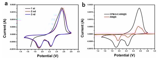 Cyclic voltammetry (CV) curves of (a) CPM-5-C@S electrodes at a scanning rate of 0.1 mV s−1 range from 1.3 to 3.0 V with 5 cycles; (b) CV curves of CPM-5-C@S and AB@S electrodes at the second cycle.