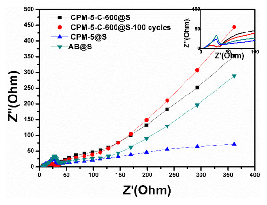 The EIS curves of AB@S, CPM-5@S, CPM-5-C-600@S, and CPM-5-C-600@S-100 cycles cathodes are showed in Figure 9. The semicircle could reflect the resistance of the electrochemical reaction at the boundary of the electrode-electrolyte, which is called charge-transfer resistance [36]. We could see that the transfer resistance of CPM-5-C-600@S electrode material was less than that of AB@S and CPM-5@S electrode, which attributes to the special structure of CPM-5-C-600. On the other hand, the Li+ diffusion coefficient (slope of oblique line) of CPM-5-C@S electrode was larger than that of AB@S and CPM-5@S electrode, because the mesopores of CPM-5-C-600 structure increased the diffusion rate of Li+ and improves the conductivity of the battery [37,38]. After 100 charge discharge cycles at 0.2 C, the cell impedance remained stable with CPM-5-C-600@S cathode. During the discharge process, the solid sulfur was reduced to polysulfide and deposited on the carrier material. This will promote the transfer impedance between polysulfides and the carrier material, but the structure of carbonized CPM-5can effectively avoided this defect. The stability of the structure, micro- mesoporous combination and indium oxide particles made the composite material cathode reduce the deposition of lithium sulfide and the obstruction of Li+ diffusion process, so as to improve the conductivity of the battery [39,40].
