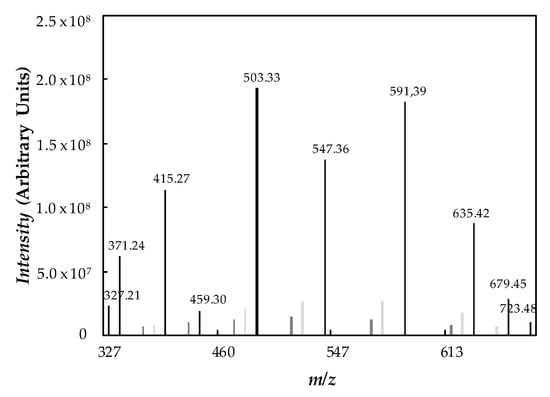 All peaks present in the mass spectra correspond to molecules cationized with H+ (m/z = 19.02 + 44.03·n, where n = 7–16), Na+ (m/z = 41 + 44.03·n, where n = 8–13), or K+ (m/z = 57.11 + 44.03 n, where n = 8–14). Therefore, average number molar mass is equal to Mn = 520.50 g·mol−1, average mass molar mass being Mw = 532.94 g·mol−1 and polydispersity index Mw/Mn = 1.02 (quasi-monodisperse polymer). Molecular mass values obtained by ESI-MS were larger than expected for a poly(ethylene glycol) commercialized as PEG400 [30,32,58,59].