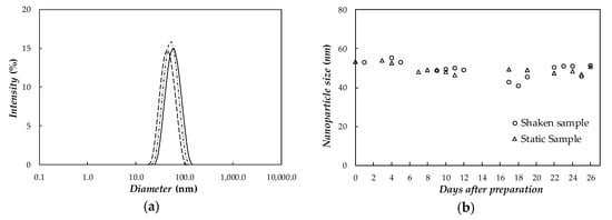 The average hydrodynamic size of dispersed Ag nanoparticles in PEG400 was analyzed by means of a Zetasizer Nano ZS (Malvern Instruments, UK) based on dynamic light scattering (DLS). The experimental uncertainty in size measuring suspended particles was estimated to be 2%, further details can be found in Fedele et al. [60] and Colla et al. [61]. In order to ensure appropriate operation conditions, a diluted concentration was selected to carry out DLS investigations. Thus, in this work analyses were performed for an Ag/PEG400 dispersion containing 0.01 wt% of nanoparticles at 298 K and with a scattering angle of 173°. As previously reported for other nanostructured materials [61], hydrodynamic nanoparticle sizes of Ag/PEG400 samples at higher concentrations were expected to be similar to the diameters here obtained for 0.01 wt% loading. Figure 5a shows the nanoparticle size distribution of Ag(0.01 wt%)/PEG400 NePCM. For this last dispersion, the average hydrodynamic diameter is ~50 ± 1 nm. DLS value is almost twice the diameter observed by using transmission electron microscopy. The reason is that DLS size is not based on direct measurements of dry nanoparticles (as in the case of TEM investigations), but on an estimation of hydrodynamic size obtained from an analysis of nanoparticle diffusion behavior. Differences between DLS and TEM size determinations were also reported in the literature for other silver nanofluids by different authors [54,55]. With the objective of evaluating Ag/PEG400 temporal stability, the evolution of average nanoparticle size was monitored in the timeframe of four weeks. Following a procedure similar to the one proposed by Fedele et al. [62], two DLS cuvettes were filled with ~1 mL of Ag(0.01 wt%)/PEG400 dispersion. The first cuvette was kept in static conditions, while the other was hand shaken for some seconds just before performing the measurements. Figure 5a shows the nanoparticle size distributions obtained at three different days after preparation for the static sample, while the temporal evolution of size determinations under static and shaken conditions is plotted in Figure 5b.