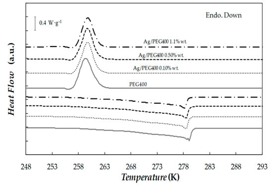 As it can be observed, the addition of nanoparticles did not significantly modify the onset temperature of the freezing process. Thus, while recrystallization started at around ~259.3 K for pure PEG400, this transition occurred at ~259.8 K in the case of the NePCM loaded with the highest nanoparticle concentration. However, with increasing silver loading, a slight shift towards lower temperatures was found in the melting transition. These lower melting temperatures (due to the dispersion of nanoparticles), led to a reduction in sub-cooling of up to 7.1% in the case of the Ag(1.1 wt%)/PEG400 sample (in comparison with neat PEG400).