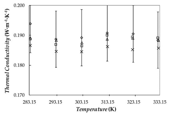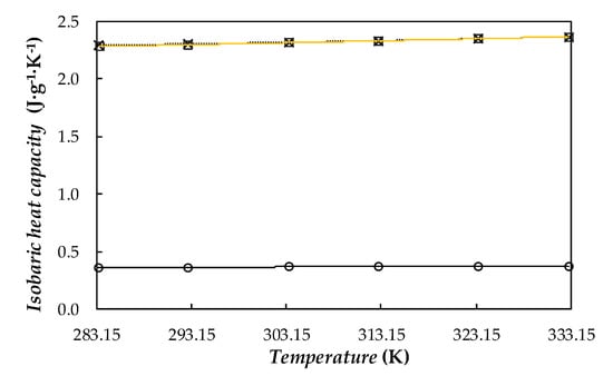 Density, ρ, was measured within the temperature range from 288.15 to 313.15 K by means of an oscillating U-tube densimeter DMA 500 (Anton Paar, Graz, Austria). Water and toluene were selected as reference materials to perform device calibration. Relative uncertainty of density measurements with this device was established to be lower than 0.1% [67].