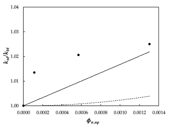 Relative thermal conductivity, knf/kbf, as a function of volume fraction, , for Ag/PEG400 nanofluids at 313.15 K. (●) Experimental results obtained in this work and predicted values by (- - -) Maxwell [74] and (—) Murshed et al. [80] models.