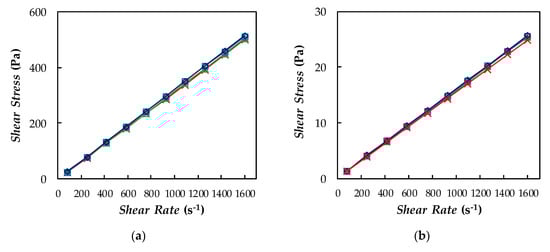 A linear rise in shear stress with increasing shear rate was observed for all studied samples. This linear relationship, which is temperature independent, confirmed that like base fluid, designed dispersions are Newtonian. As pointed out by [93], this fact can be interpreted as an indication of the quality of dispersions and lack of agglomerates or aggregates in proposed NePCMs. This result agrees with the Newtonian behavior in the shear rate region of 1–200 s−1 observed by Tamjid and Guenther [94] when investigating di(ethylene glycol)-based nanofluids containing 0.11% and 0.22% volume concentrations of silver nanoparticles. However, as reported in that study, larger amounts of nanoparticles led to a non-Newtonian or pseudoplastic behavior.