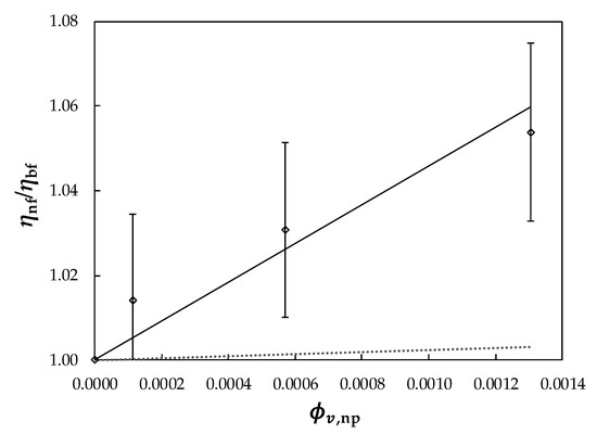 Viscosity ratios ηnf/ηbf vs. silver nanoparticles volume fraction, (, np) at 313.15 K. (◇), experimental values; (·····) Einstein; (—) Equations (7) and (8). Error bars indicate 2% uncertainty.