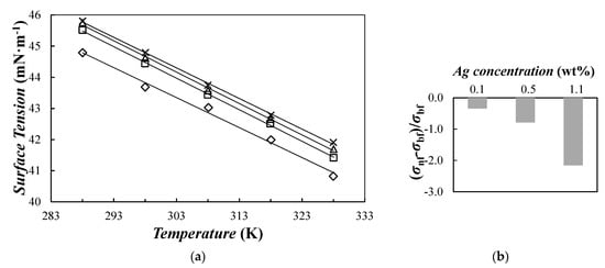 The surface tension of silver dispersions in water was studied by Chen et al. [48] and Godson et al. [49]. Chen et al. [48] observed decreases in σ with either surfactant addition or Ag concentration (especially when nanoparticle loading overcame 0.2 wt%). Also a decreasing trend with silver content was detected by Godson et al. [49]. In this last study, maximum reductions in surface tension reached 10.3% at 323.15 K for the highest analyzed silver concentration (1.2 vol%). Silver-particle colloids have been considered as potential conductive inks for inkjet printing. Thus, Lee et al. [50] designed silver colloids based on a diethylene glycol–water mixture (50:50 in mass) and stabilized with a 40·103 molecular weight PVP (with an Ag:PVP ratio of 1:8), and the authors studied the effect of Ag concentration on the dynamic viscosity and surface tension of designed samples. Both properties were found to increase with nanoparticle loading, reaching enhancements of ~3% (σ) and ~400% (η) at the highest Ag concentration (35 wt%). Also important increases in dynamic viscosity were reported by Ankireddy et al. [51] when they studied dispersions (up to 66 wt%) of carboxylic-acid-encapsulated silver nanoparticles in toluene. However, the authors observed that surface tension decreased with the addition of nanoparticles, with maximum diminutions of ~29% for the highest Ag content. Reductions in this property were attributed to a lessening in the interactions between toluene molecules at the droplet surface.