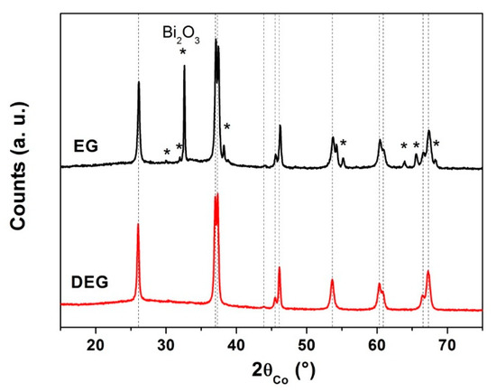 In order to determine if the use of ethylene glycol (EG) instead of diethylene glycol (DEG) has an impact on the structure and microstructure of the powders, a synthesis was made with EG (Alfa Aesar, Thermo Fisher, Karlsruhe, Germany, 99%) as solvent instead of DEG. As the boiling temperature of EG is 189 °C, the heating under reflux of the solution was realized at 190 °C. In both polyols, the dissolution of the iron nitrate was easy, the solution, initially transparent, becoming orange. Indeed, simple stirring was enough for its complete dissolution. This may be due to the dissolving role of polyols on transition metals [16]. However, the bismuth nitrate cannot be dissolved at room temperature with magnetic stirring. Actually, bismuth grains remain visible until the solution starts to become obscure when the temperature reaches 150 °C during the heating under reflux. After centrifuging and drying the precipitate, the precursors were heat treated at 500 °C for 2 h under air. As evidenced by XRD (Figure 1), the use of EG leads to the development of secondary phases, while the DEG was suitable for the formation of pure BFO (rhombohedral R3c symmetry) by the polyol process.
