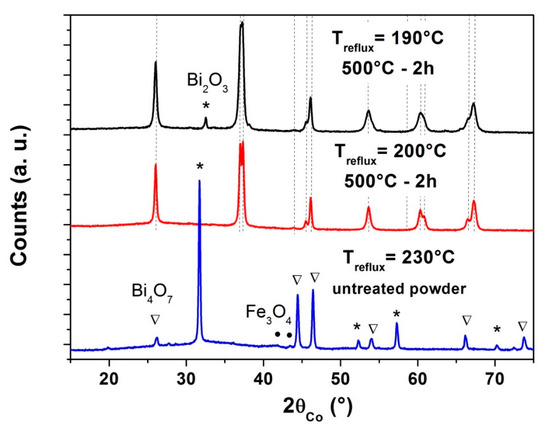 In the case of various heating temperatures of the solution under reflux, the purity of the final powders was largely affected (Figure 2). For the synthesis performed at 230 °C, in order to be closer to the DEG boiling temperature, the obtained precursor was already crystallized and this crystallization during reflux would not allow the formation of pure BFO powder, as it was always observed when a problem occurred during the synthesis of other precursors which were already crystallized. Heating under reflux at 190 °C led, after the heat treatment of the precursor at 500 °C for 2 h, to the presence of about 10 wt% of Bi2O3 (or Bi-rich phase, that present quite the same XRD pattern) in addition to the BFO phase.