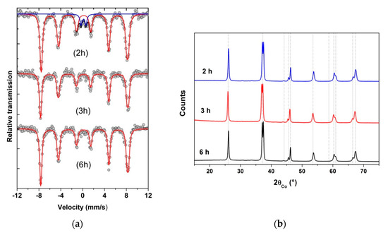 (a) Mössbauer spectra, registered at room temperature, showing the presence of a 7% paramagnetic impurity (Millite phase) for the shorter reflux duration 2 h (C = 0.06 mol·L−1) while in the (b) XRD pattern of the same samples, only a BFO phase is detected for 2, 3 or 6 h of reflux.