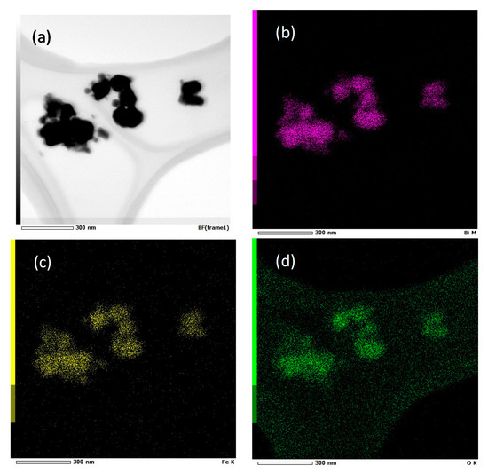 STEM image (a) and X maps of the precursor prepared with C = 0.06 mol·L−1 and a reflux of 3 h at 200 °C and then heat treated at 500 °C for 2 h, evidencing the homogeneity in composition of the particles. (pink: bismuth (b), yellow: iron (c), green: oxygen (d)).
