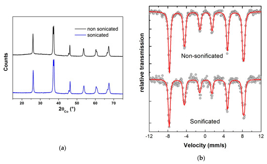 The purity of both powders issued from the dissolution of the reagents by sonication or only by magnetic stirring (without any prior sonication) was determined by XRD and Mössbauer measurements for the concentration [Bi + Fe] of 0.06 mol·L−1 (Figure 5). Whatever the dissolution method employed, after a heat treatment of precursors at 500 °C under air, the resulting powder is pure (only BFO phase) according to the XRD characterizations. This result is confirmed by the analysis of the Mössbauer spectra of the different samples, as there is no variation of the hyperfine parameter values of both samples, as shown in Figure 5b. Moreover, the sonication does not drastically influence the crystallite size as it is of around 42 nm, with or without sonication.