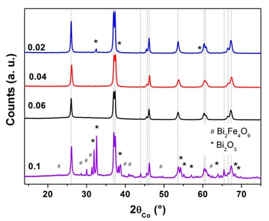 In order to reduce the BFO particle size, we varied the molar concentration of cations [Bi + Fe] in the solutions as follows: 0.1, 0.06, 0.04, 0.02 mol·L−1, which are considered to be very low for chemical soft methods. The precursors obtained after the heating of the solution under reflux for 3 h, were heat treated at 500 °C for 2 h. The final powders were pure for the concentrations 0.06 and 0.04 mol·L−1 (Figure 6), while a higher concentration of 0.1 mol L−1 led to a crystallized precursor, the powder obtained after the heat treatment at 500 °C for 2 h under air always containing, with such crystallized precursors, impurities in addition to the BFO phase. For the lower concentration C = 0.02 mol·L−1, the final powders contained impurities (8 wt% of Bi2O3). Moreover, the formation of the precipitate during the heating of the solution under reflux was reduced and in the case of the concentration 0.02 mol·L−1, the quantity of precipitate that was collected was very low.