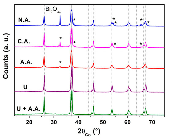 In this way, different acids (nitric acid, citric acid or acetic acid) and/or urea (that leads to the formation of hydroxide groups when it decomposes under heating of the solution) were added to the optimized solution (bismuth and iron nitrates dissolved in DEG with C = 0.06 mol·L−1). This solution was then heated under reflux at 200 °C for 3 h and the precursor was heat treated at 500 °C for 2 h under air.