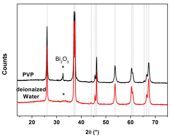For the surfactant, PVP, the first experiment done with 1.44 g in 15 mL of DEG did not lead to the formation of a precipitate of Bi and Fe, and the final solution remained orange transparent with agglomerated PVP that do not completely dissolved. After the optimization of the required quantity to ensure the occurrence of the precipitation, we determined that the value of C = 4.10−4·mol·L−1 of PVP leads to a higher purity of the powder. However, 9 wt% of the Bi2O3 impurity was detected (Figure 8). Moreover, the crystallite sizes obtained with PVP polyol solution or without, are quite similar (39 nm with PVP instead of about 43 nm). In addition, TEM images do not evidence a lowering of the agglomeration of the powders, as it could be expected (Figure 9h).