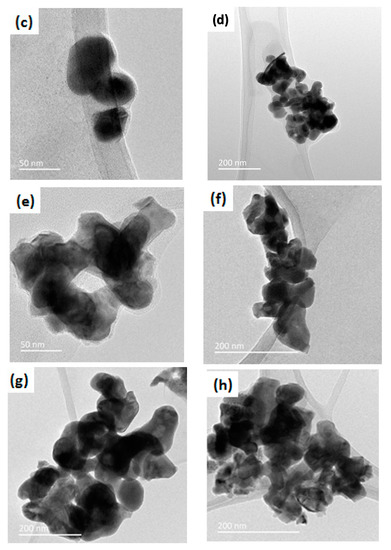 TEM images showing the precursors heat treated at 500 °C for 2 h and synthesized with (a) reflux for 6 h, (b,c) reflux for 3 h (d) reflux for 2 h, (e) addition of water, (f) addition of urea, (g) addition of acetic acid and urea and (h) addition of PVP, (C = 0.06 mol·L−1). The last four samples were refluxed at 200 °C for 3 h.