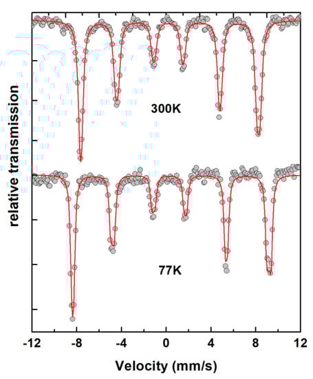 The magnetic behavior of BFO powders was explored by Mössbauer spectrometry, employing a 57Co source, in transmission configuration with a constant velocity of 12 mm·s−1.
