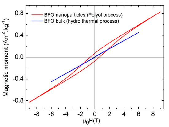 M(H) loop measurements at different temperatures, ranging from 4 K to 300 K, were carried out to check the macroscopic behavior of the magnetization of the BFO nanostructured particles. Figure 11 shows clearly that the M(H) curve for the BFO nanoparticles (≈40 nm) made with the polyol process exhibits a non-saturated ferromagnetic behavior compared to a micrometric size BFO powder (≈200 nm) with a G-type antiferromagnetic order.