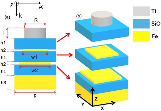 z-axis and with the electric and magnetic fields polarized along the x and y directions, respectively. As the incident light was illuminated on the designed structure, the LSPR could be excited in the thin SiO layer between Ti and Fe layers, which could produce a stronger near field in the confined nanospace. The diameter and thickness of Ti and the thicknesses of SiO layer and two Fe-SiO layers were properly optimized to better confine the near field. The period P is set at 300 nm, for that the designed absorber is a sub-wavelength structure for the incident wavelength. The diameter (R) of top disk is 140 mm. The top square layer has a width (w1) of 220 nm and below square layer has a width (w2) of 280 nm. Thicknesses of the absorber from top to bottom are 155 nm (l), 170 nm (h1), 10 nm (h2), 170 nm (h3), and 300 nm (h4), respectively. The spectral absorption rate of the absorber can be obtained by Absorption (A) = 1 − reflection (R) − transmission (T). As the thickness of bottom metal substrate is thicker than the skin depth of the optical range of visible light to infrared region, the transmission of the proposed structure is zero. Therefore, the absorption could be represented as A = 1 − R. SiO could be recognized as the lossless material with a refractive index (n) of 1.53 and the optical parameters of the metal Ti and Fe were taken from CRC