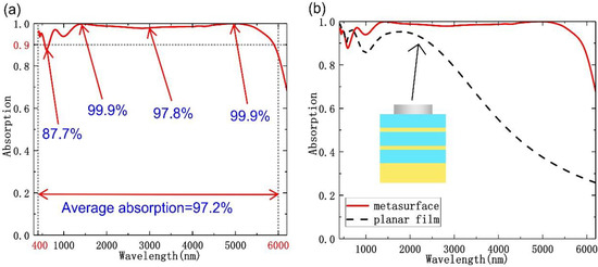 Table 1 that our proposed absorber could offer wider absorption bandwidth from visible to infrared light. The most important thing is that our proposed absorber is low cost (with no noble metal) and has ultra-thin thickness. To additionally verify the advantages of the investigated metasurface, we compared the absorption spectrum of the metasurface structure with that of planar structure (planar structure), where the all other parameters were identical to those of the proposed one. The absorption spectra of two cases are compared in