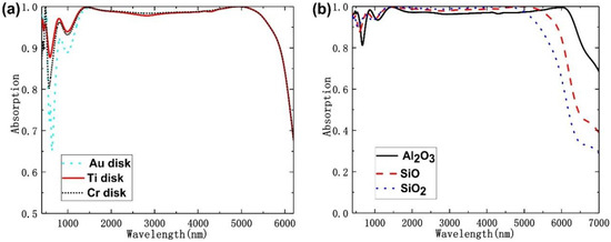 Figure 9a for different metals, including Ti, chromium (Cr), and gold (Au). We had apparently found that the top metal had large effect on the absorption spectra in the region of visible to near-infrared light (i.e., from 400 to 1500 nm). When Au disk was used as top metal, absorption rate from visible to near-infrared was very low. Also, using Cr top metal the absorption rate is smaller than that of Ti metal in the discussed region of visible to near-infrared light. These results prove that the absorption performance in the visible region (400 to 1500 nm) is closely related to the top metal, which matches the electric field distributions (@500 nm, @1500 nm) in