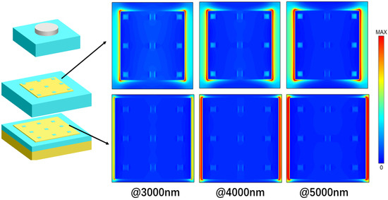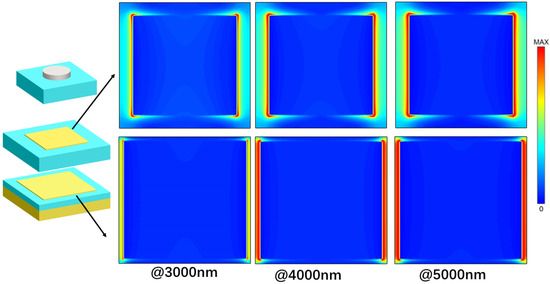 Figure 7. From these figures, we could find that there existed the effect of localized electrical field enhancement around the two edges of the top disk and two metallic layers, which were caused by the different resonant wavelengths. The absorption in shorter wavelengths (@ 500 nm) is mainly caused by the oscillations located in upper Ti disk. With increasing the wavelength of incident light, the electromagnetic oscillations located in the upper Ti disk become weaker, but the oscillations located in lower Fe layer are enhanced with increasing operating wavelength. In addition, the wider Fe layer could support the electromagnetic oscillations at longer wavelengths. These results prove that the lower metallic layer could support the electromagnetic oscillations at longer wavelengths and the enhancement behavior of strong LSPR and super positions of resonant frequencies lead to the strong absorption in such a broadband region.
