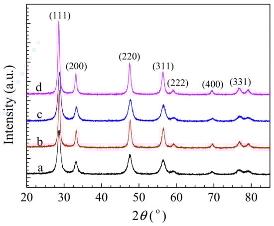 X-ray powder diffraction (XRD) patterns of (a) CeO2-S, (b) CeO2-SK, (c) Pd/CeO2-S and (d) Pd/CeO2-SK.