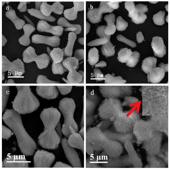 SEM images of sheaf-like CeO2 supports as well as the Pd loaded catalysts are displayed in Figure 2. Clearly, the Pd loaded catalysts maintained the original morphology of those CeO2 carriers. The obtained CeO2-S support (Figure 2a) resembled a wheat bundle composed of many filamentous crystals, which was bandaged in its middle and fanning-out at both ends. Similar structures have been observed for CuO and Bi2S3 in the literature [,]. The average diameter of the individual nano-filament was about 10 nm and the bundles length was about 6–8 µm. Moreover, a smooth surface of the sheaves particles could be observed. However, after KOH etching, the surface of CeO2-SK bundled particles become rough due to the formation of a large number of nanorods (Figure 2c,d).