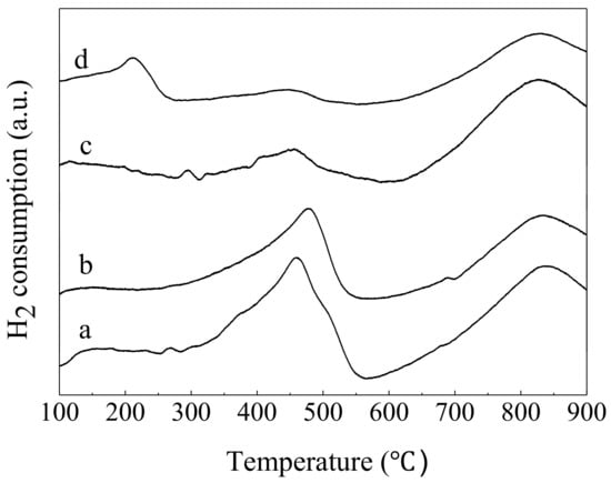 Meanwhile, a Micromeritics AutoChem II 2920 Chemisorption Analyzer (Micromeritics Instrument Co., Atlanta, GA, USA) with a TCD detector was adopted for H2-temperature programmed reduction (H2-TPR). Typically, approximately 50 mg catalysts were reduced under a 10 vol % H2-Ar mixture. Before the H2-TPR analysis, the catalysts were treated under an air flow at 500 °C for 30 min, followed by purging with pure N2 at the same temperature for 30 min and then cooled down to 0 °C. After that, the reduction process took place in the temperature range of 0–900 °C.