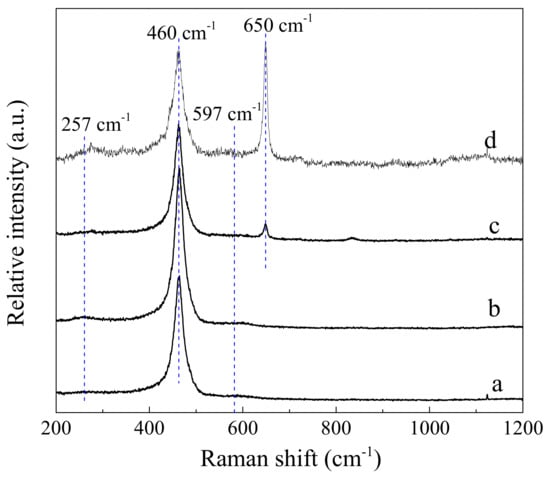 The Raman spectra of sheaf-like CeO2 supports and the Pd loaded catalysts are shown in Figure 5. For ease of observation, the Pd/CeO2-SK data is enlarged four times. For CeO2 supports, the main bonds at 460 cm−1 correspond to the F2g Raman active mode of CeO2 fluorite structure [,,,]; the weak bands at about 597 cm−1 are assigned to the defect induced mode (D-mode), which should be associated with the existence of oxygen vacancies caused by Ce3+ ions in the CeO2 lattice [,,]; the bands at 257 cm−1 are ascribed to the second order transverse acoustic mode (2TA-mode) [].