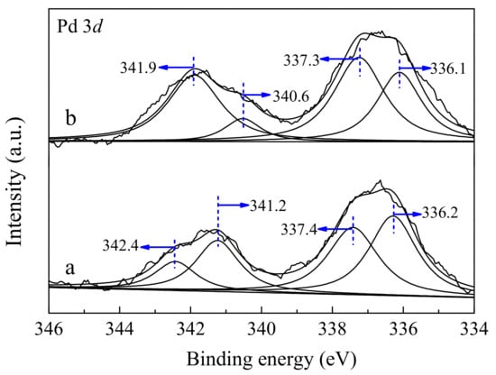 The catalysts surface area was analyzed by a TriStar 3000 Gas Absorption Analyzer (Micromeritics Instrument Co., Atlanta, GA, USA) and N2 physisorption at −195.8 °C. The samples were degassed at 200 °C and 6.7 Pa for 2 h prior to the measurement. The Pd content in the catalysts was determined by inductively coupled plasma atomic emission spectroscopy (ICP-AES; PerkinElmer Co., Waltham, MA, USA). X-ray powder diffraction (XRD) patterns of the catalysts were detected by an X-ray diffraction system (Bruker Corporation, Billerica, MA, USA) using Cu Kα radiation (154.06 pm, 40 kV and 40 mA). The diffraction spectra were collected over the 2θ range of 5–85° at a scanning rate of 4°/min.