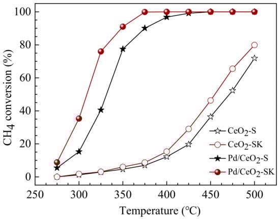 It can be seen from Figure 9, CeO2-S and CeO2-SK supports show poor activity in lean methane combustion and the CH4 conversion values at 500 °C are only 71.9% and 79.9%, respectively. After deposition Pd component, the CH4 conversion of the Pd-containing catalysts was increased significantly, suggesting the important role of Pd in lean methane combustion. Moreover, it also shows that the activity of the as prepared Pd catalysts depended largely on the structural feature of CeO2 supports such as its exposing crystal face; the Pd/CeO2-SK catalyst shows a high activity, superior to the Pd/CeO2-S catalyst. Over the Pd/CeO2-SK catalyst, CH4 conversion reached 91% at 350 °C and 100% at 375 °C, while the full conversion of CH4 was achieved at 425 °C for Pd/CeO2-S catalyst.