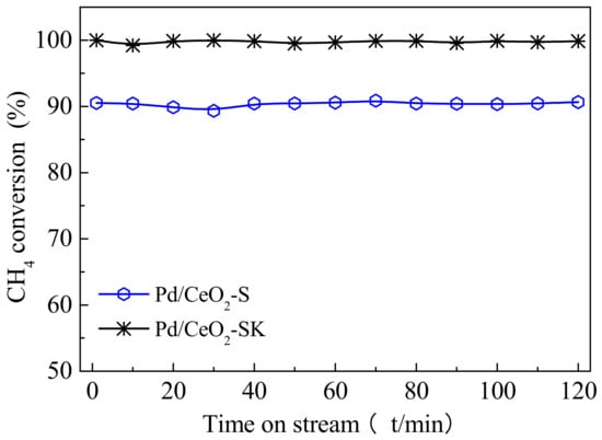 Long-term tests were also performed for CH4 catalytic combustion over the Pd/CeO2-S and Pd/CeO2-SK catalysts at 375 °C, as shown in Figure 10. Clearly, the Pd/CeO2-S catalyst displays a CH4 conversion about 90% and that of the Pd/CeO2-SK catalyst is approximately 100% during the 120 min test process. Both of the two Pd-containing catalysts show good thermal stability. Moreover, as shown in Figures S1 and S2 in the Supplementary Information, there are no structural changes for the Pd/CeO2-S and Pd/CeO2-SK catalysts after the long-term tests, in comparison with the fresh ones.